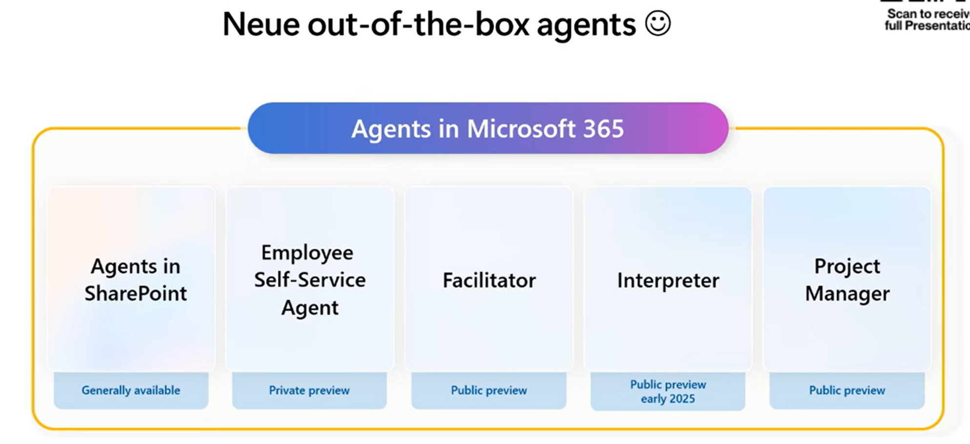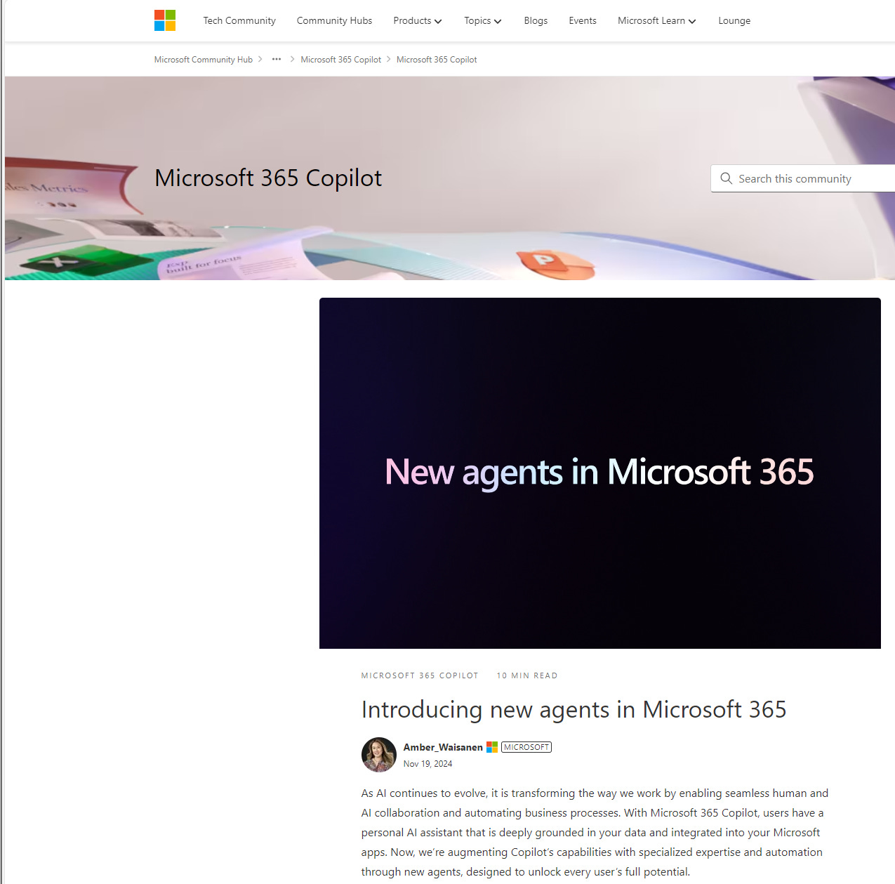 Employee Self-Service Agent: The Employee Self-Service Agent in Microsoft 365 Copilot Business Chat (BizChat) will expedite answers for the most common workplace policy-related questions and will take action on key HR and IT related-tasks. From BizChat, users can retrieve benefits and payroll information, start a leave of absence, request a new laptop with IT and even get assistance for Microsoft 365 products and services, all in one place. This agent is in private preview. Introducing the Employee Self-Service Agent in Microsoft 365 Copilot | Microsoft Community Hub